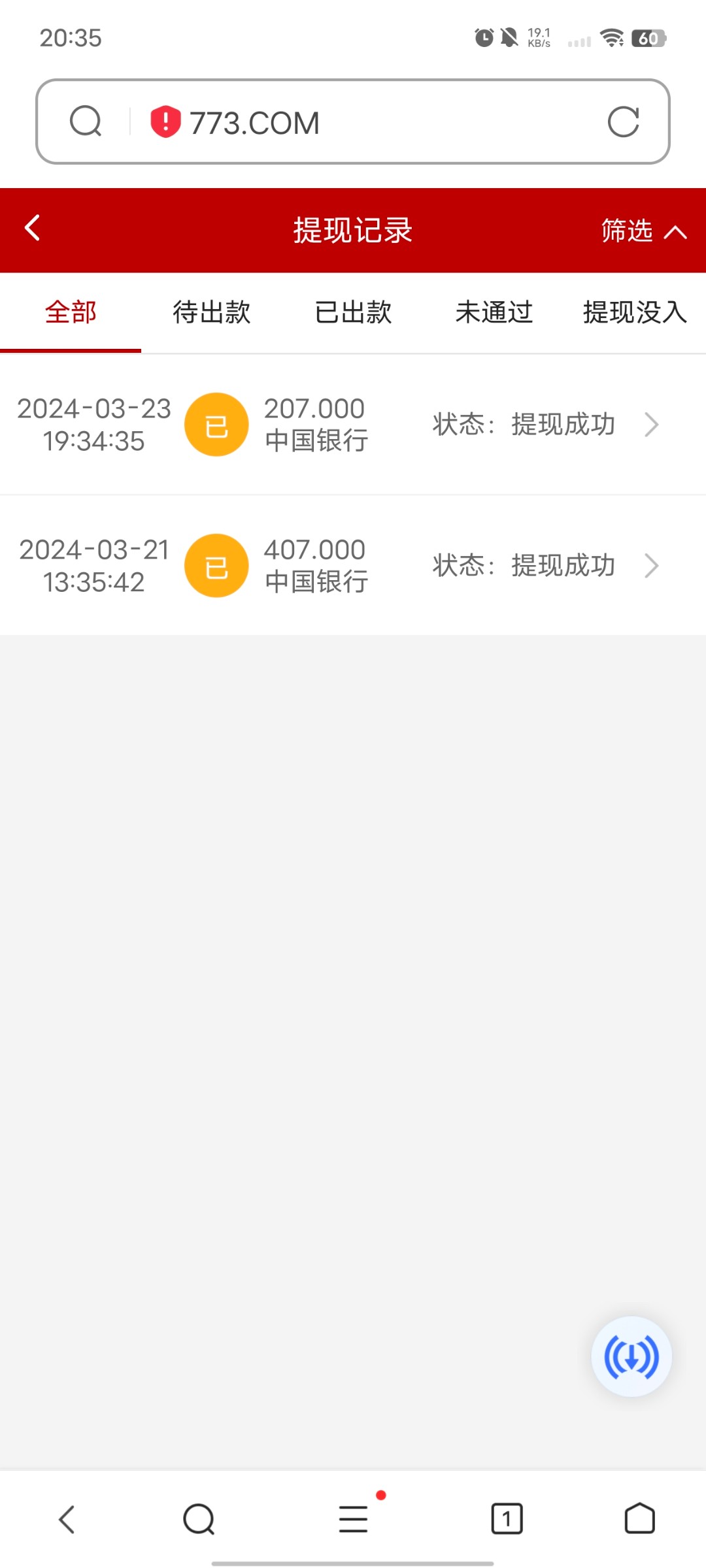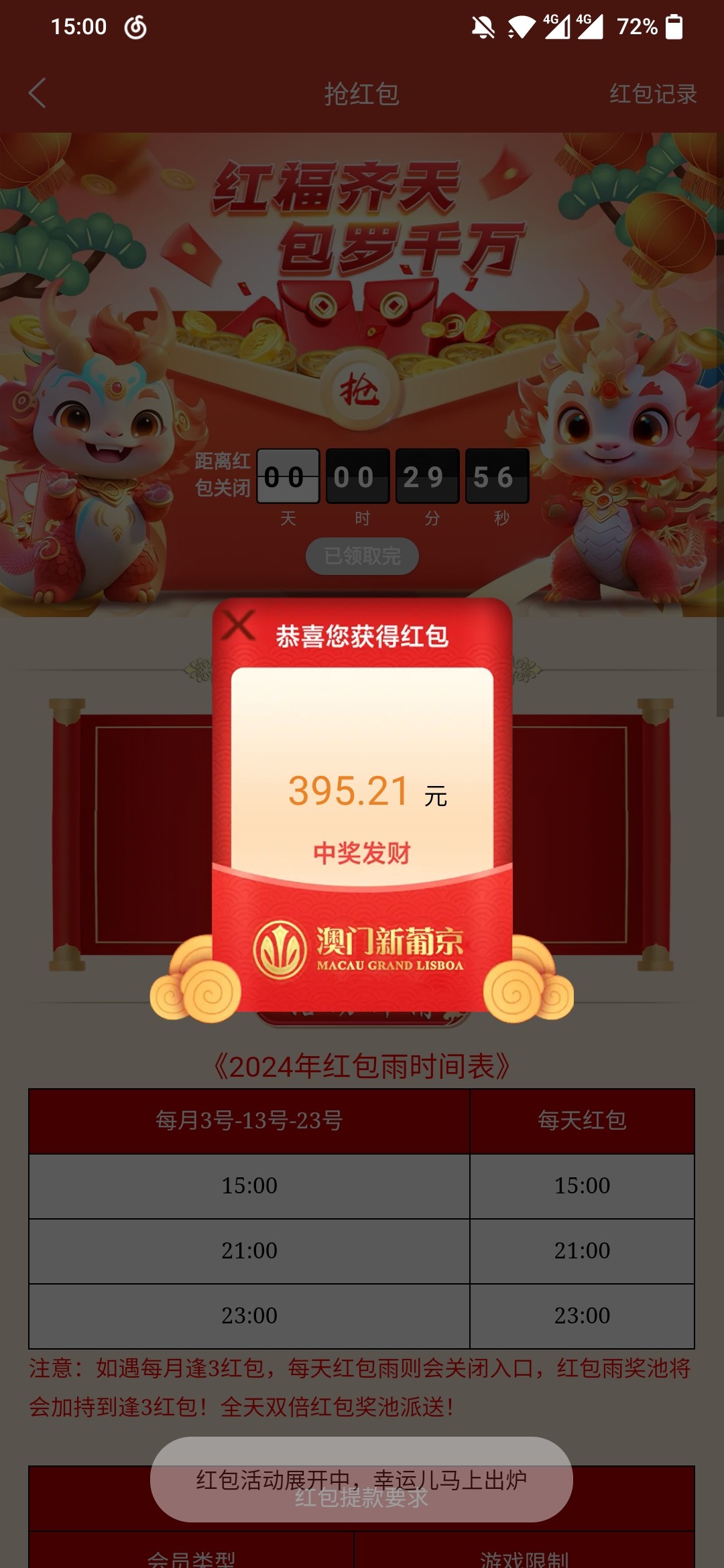773  红包1块钱  拉了一下没有退出去进来最后一块 来了一堆发财  后面摇了两下来个胡 116直接提款