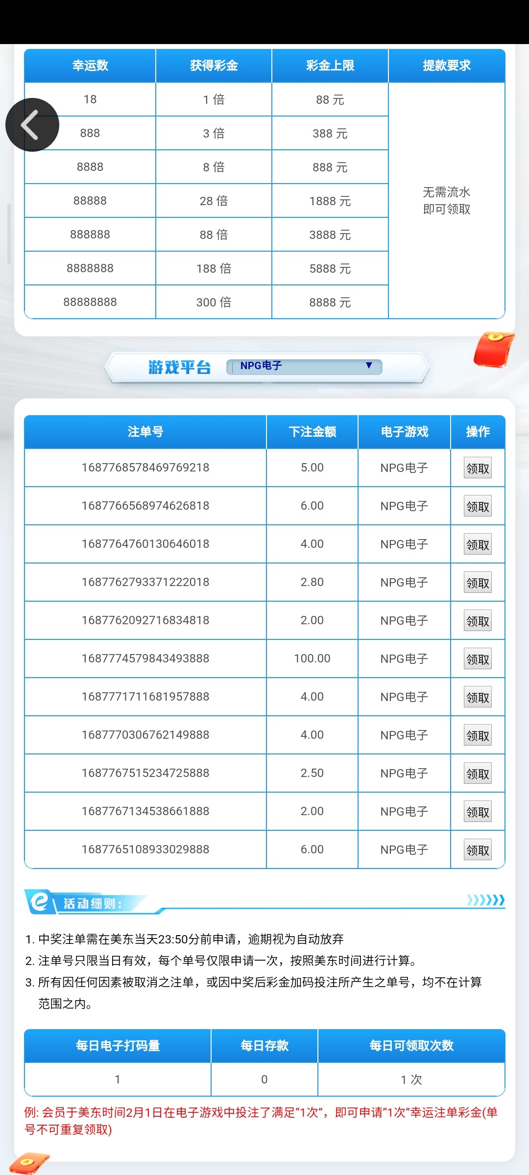我比较喜欢买免费,这个台买免费有幸运注单,除了这个台,其他的好像买免费的注单好像都是不算幸运注单的,我不是第一次领这玩意了,好多次了,美滋滋,提现了还又领300