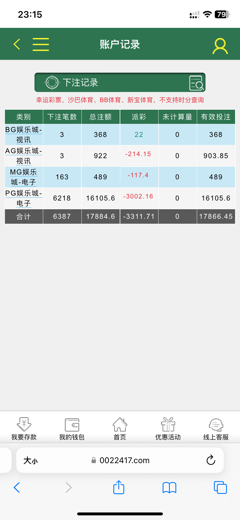 纯黑台也玩,厉害。为什么417黑?我告诉你我钱能系统台两年存提100个加,417就是后面跟风出的,当时靠买的手机名单发特邀彩金火了两个月,基本你其他台数据他417都有。我就注册第一天存了近4000去扑他,而且不是一次性,是多笔正常钱能存款,最后一笔提款8000直接给我账号冻结了。同样情况也发生过在989大发,