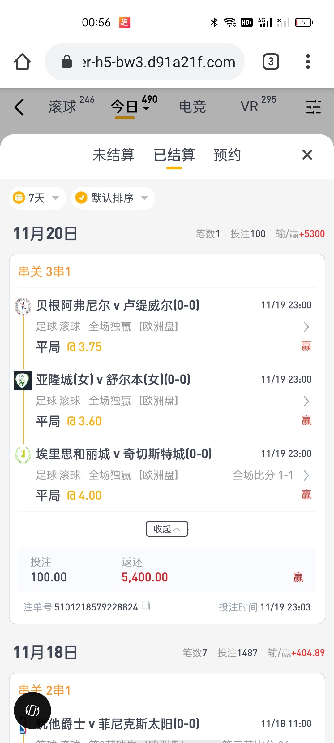 不懂足球随便下的 之前下独赢都喜欢和 随便串了三个 也祝兄弟们发财 第三个串子最后五分钟来了一球 谢天谢地