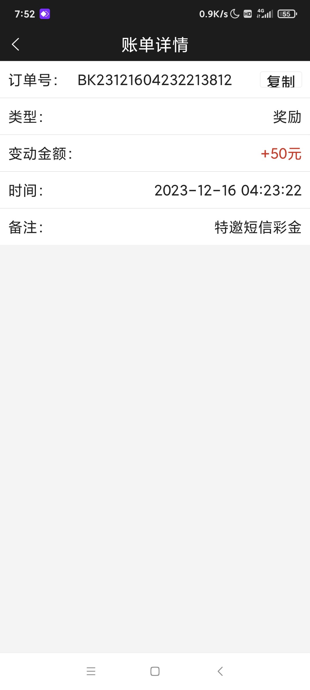 刚刚去领了860的50特邀来打了。出了个600,平常都懒得去看的,因为发短信这些容易被风控预警什么的。