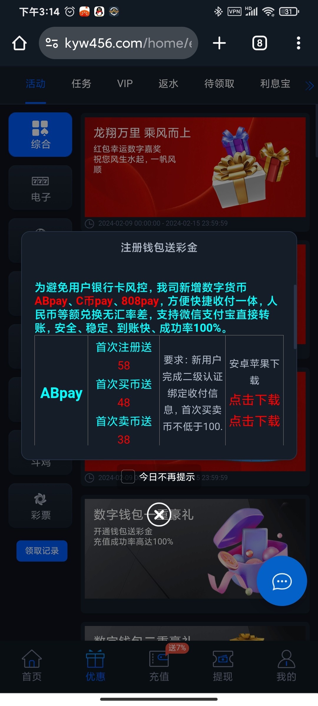 ③申请彩金:实名通过后联系钱包客服提供ab号申请彩金,联系后需要等待十几分钟,目前所有人都到了,没有不到的情况但是不敢保证,反正大概率能到(想下app的自己联系钱包客服要下载链接,好像不下载也没事,截图充值码然后点打开app会打开网页版登陆扫码就好)