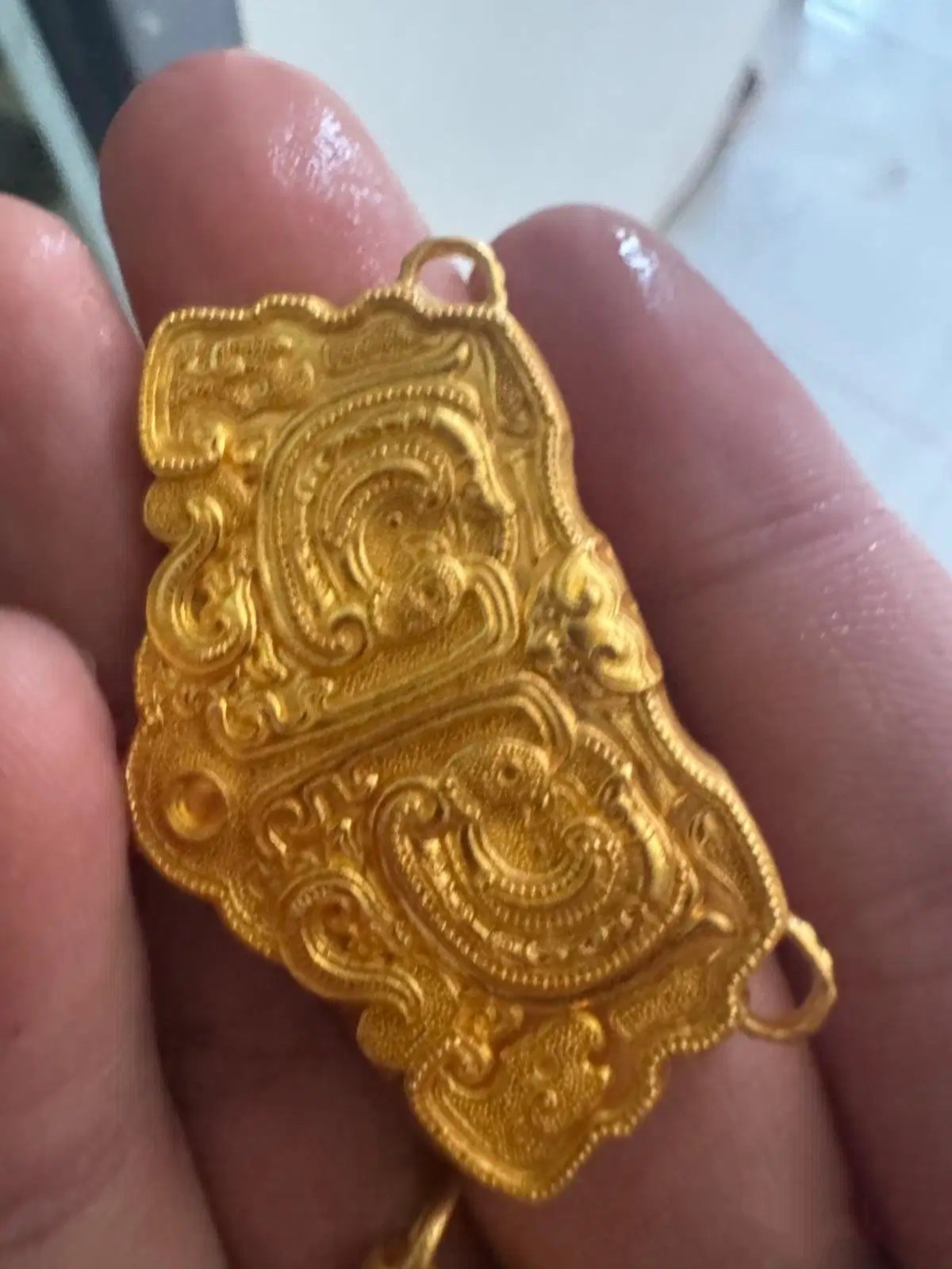 老哥们,今天起床骑电动车吃饭的时候,在路上看到一个金黄黄的东西在路边草里,本来也没注意,刚好太阳照到了金黄黄的,现在我不知道咋办了老哥们,用打火机烧了半天没掉色,看着像脖子戴的东西,怎么办老哥们